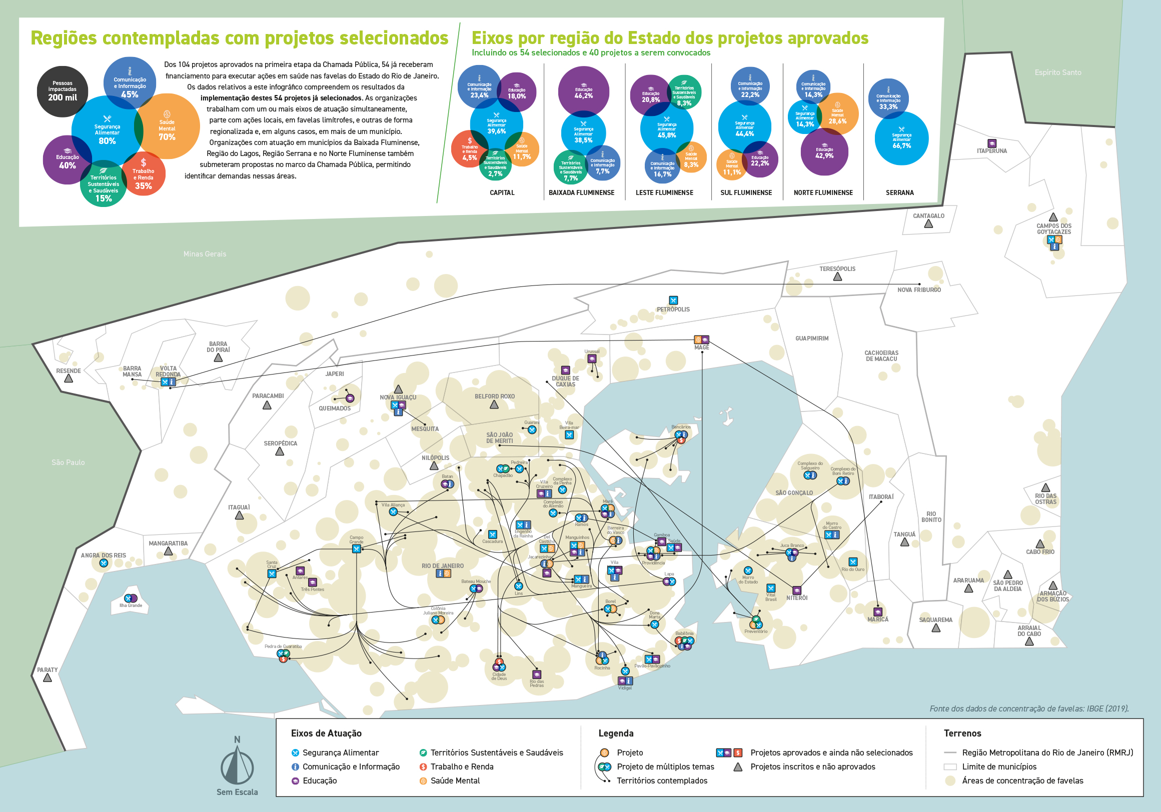 | 12) | Portal Favelas | Portal Favelas no combate à COVID-19: saúde mental, politização e informação preventiva | 1.500 | Fomentar acomunicação popular através de um Portal de notícias desenvolvido por moradores de favelas por meio de conteúdos integrados às favelas. Auxiliar na comunicação em saúde e COVID19. Atender na área de Saúde Mental vítimas da violência do Estado nas favela. Realizar oficinas/palestras socio-educativas sobre temas relavantes para as favelas | Favelas do estado do Rio de Janeiro, como foco no Jacarezinho, Mangueira, Manguinhos, Rocinha, Vidigal, Santa Marta, Vila Vintém, Complexo da Maré, Complexo do Alemão e Vigério Geral | R$43.876,48 | 13 (Finalizado) |