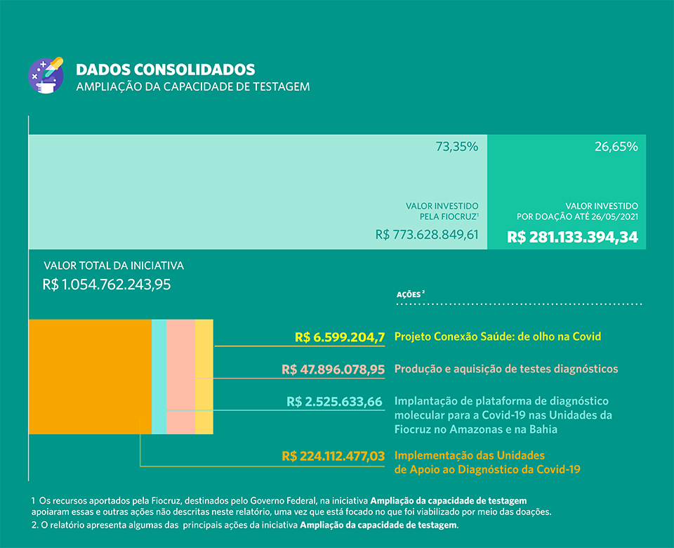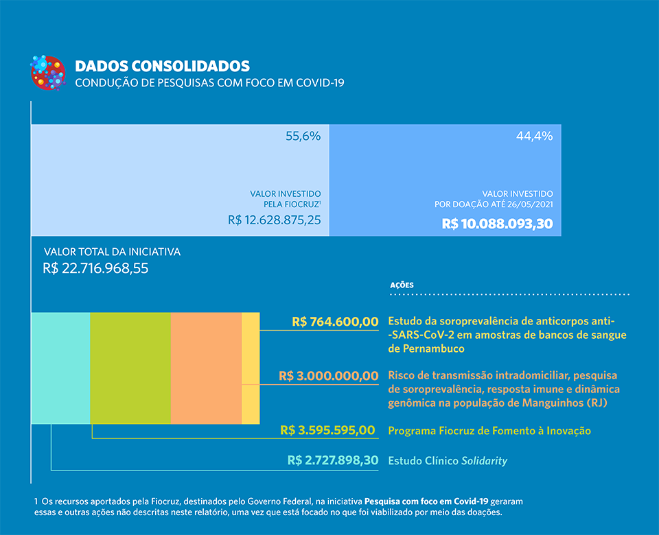 Nosso objetivo é fornecer a contextualização das diversas ações de enfrentamento da pandemia, no âmbito da Fiocruz, que, de diferentes formas, contemplaram todos os 26 estados do Brasil. Assim, entendemos que se possa aferir, com mais precisão, o alcance e os efeitos dos recursos doados que se somaram aos aportes financeiros extraordinários do Ministério da Saúde, aprovados pelo Congresso Nacional, e ao orçamento próprio da Fundação.