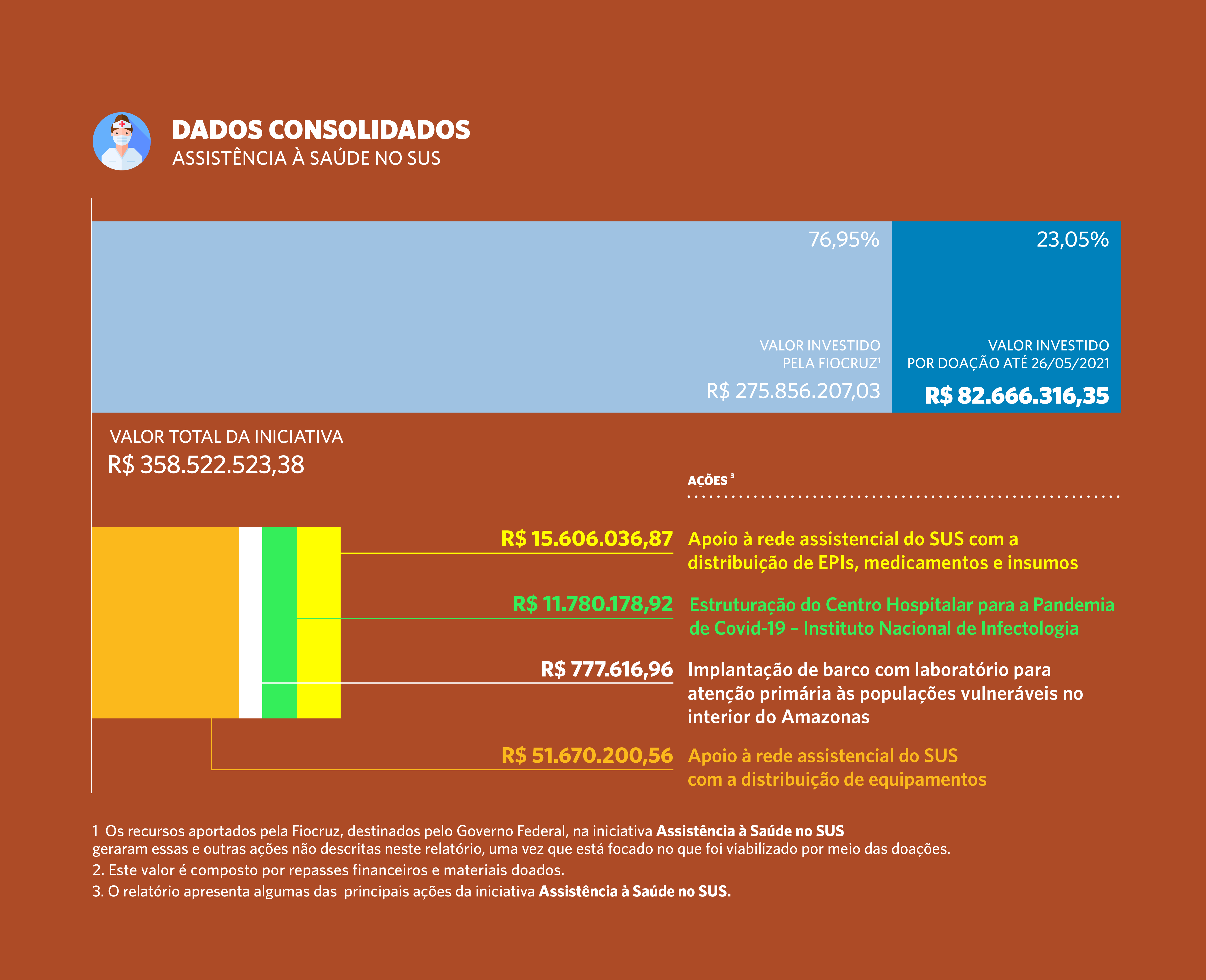 Automação, aquisição de equipamentos e insumos para o novo Centro Hospitalar. + 2,5 milhões de EPIs distribuídos e equipamentos do novo barco-laboratório da Fiocruz. 216 ventiladores pulmonares, 46 bombas de infusão e 28 monitores multiparamétricos doados ao SUS. |