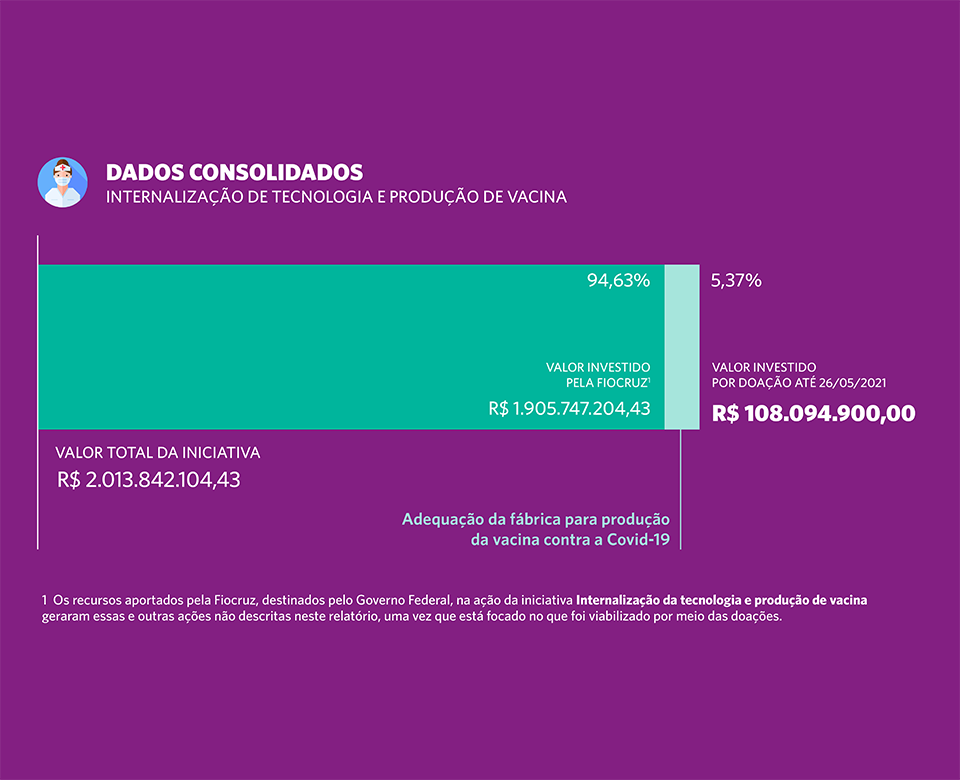 | Principais resultados gerados por doações | Aquisição de equipamentos e adaptação da fábrica para produção da vacina contra a Covid-19. |