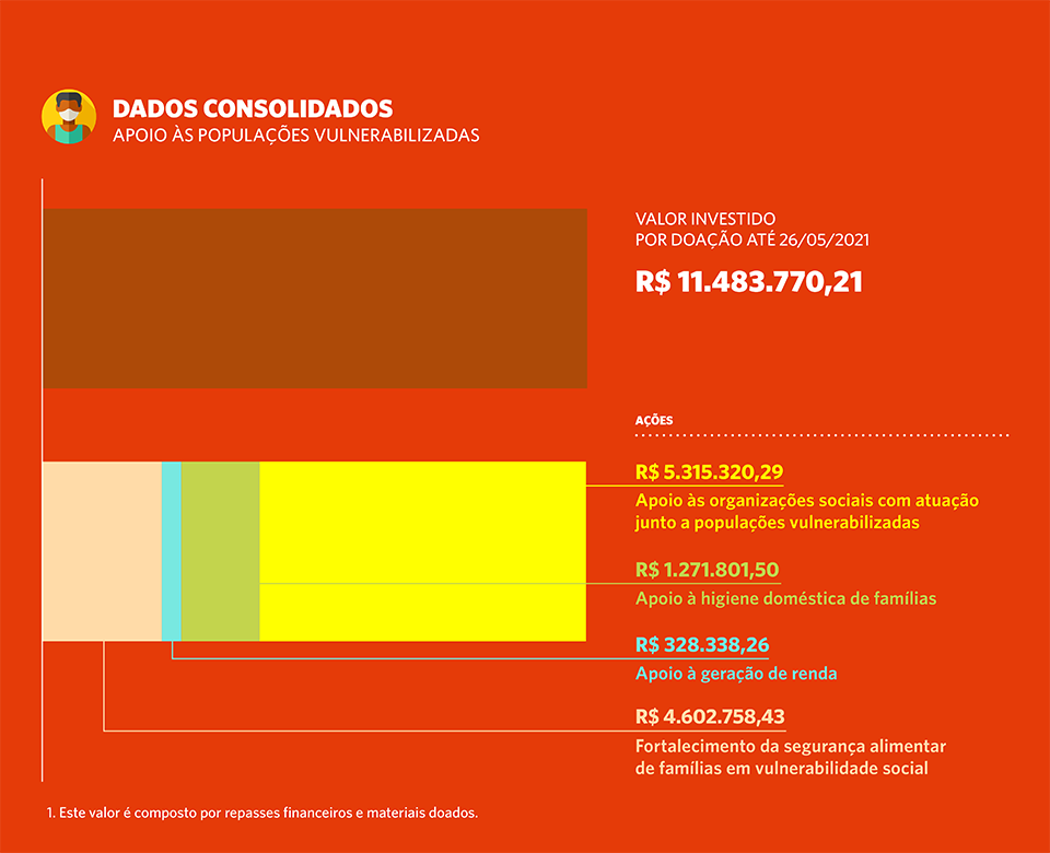 70 mil cestas básicas e 31 mil kits de higiene doados. +100 mil litros de álcool distribuídos para hospitais e comunidades. 145 projetos sociais apoiados. +1 milhãode pessoas atendidas por programas de segurança alimentar e atenção à saúde. |