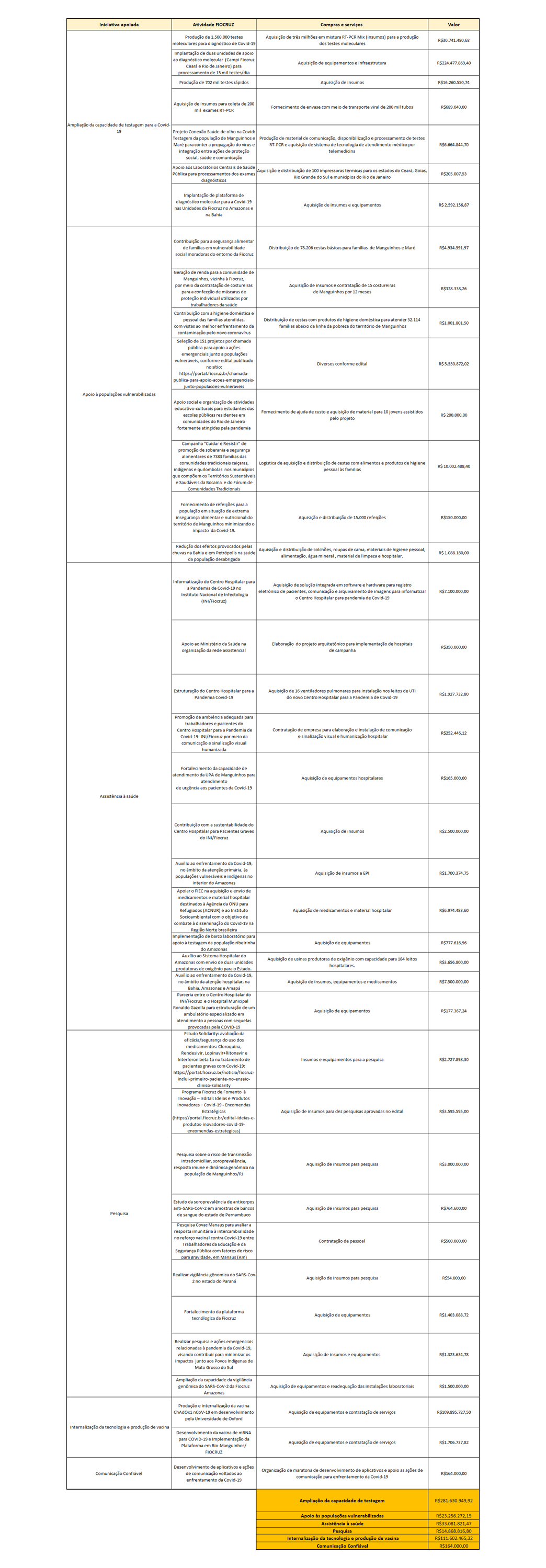 A Fiocruz em parceria com indivíduos e organizações públicas e privadas interessadas em contribuir com ações de combate à pandemia de Covid-19 apresenta os resultados e importantes contribuições para este momento de crise sanitária. A Vice-Presidência de Gestão e Desenvolvimento Institucional da Fiocruz, por meio do seu Escritório de Captação de Recursos, coordena a mobilização dos recursos captados, além de ser a responsável pela gestão e prestação de contas dos valores doados à Fiocruz. Ao término da pandemia, todas as iniciativas realizadas e seus respectivos resultados serão apresentados em um relatório digital disponibilizado nesta plataforma. A Fiocruz agradece a parceria para o enfrentamento do novo coronavírus.